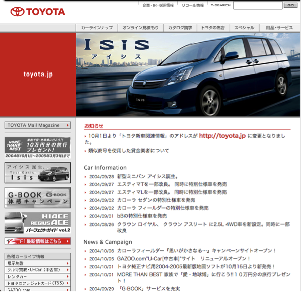 以下の写真は2004年10月のトヨタ自動車のコーポレートサイトです。現在のコーポレートサイトと比べるととてもシンプルなデザインで、最新情報をファーストビューに載せる事でユーザーが情報を得やすいページ構成になっています。