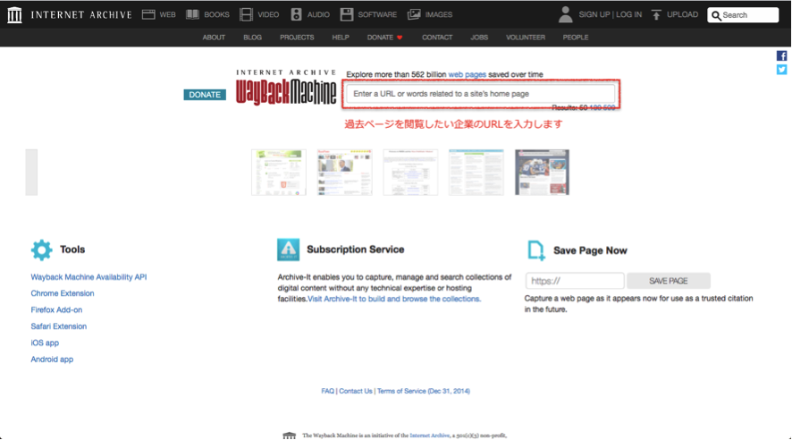 過去のコーポレートサイトは「Wayback Machine」というサイトを使用して閲覧しています。画像の赤枠部分に調べたいサイトのURLを貼り付ける事で、過去に遡ってデザインを閲覧することができます。デザインの変遷が見えて面白いサイトなので一度ぜひお試し下さい。