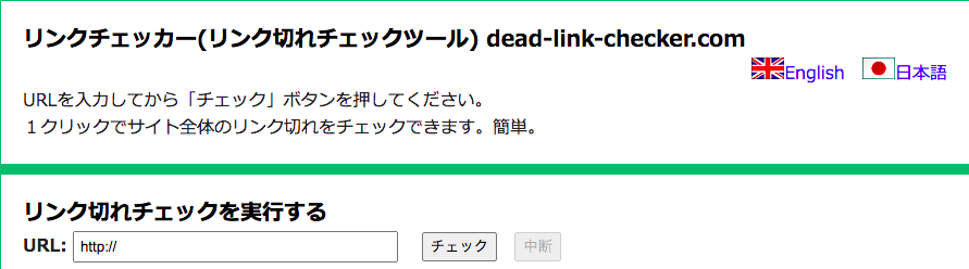 リンク切れしているページが無いかチェックするには「dead-link-checker.com」というツールが便利です。リンク切れのチェックをしたいWEBサイトのURLを検索ボックスに貼り付けて「チェック」を押すだけでチェックができます。