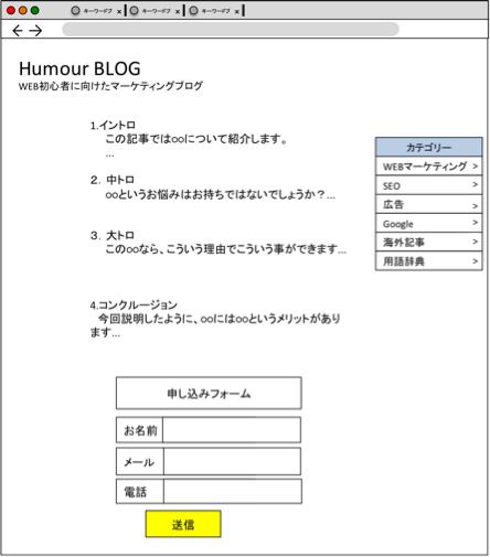 企業ブログとは、自社のノウハウや知見を記事として提供することで、その企業への信頼感を向上させる事を目的とした取り組みの事を表します。一般的にコンテンツマーケティングと呼ばれます。この企業ブログでは、記事を読んだユーザーが「ブログから自社に興味を持ってくれたか?」を確認したいので以下の点を設定します。- お問い合わせ
