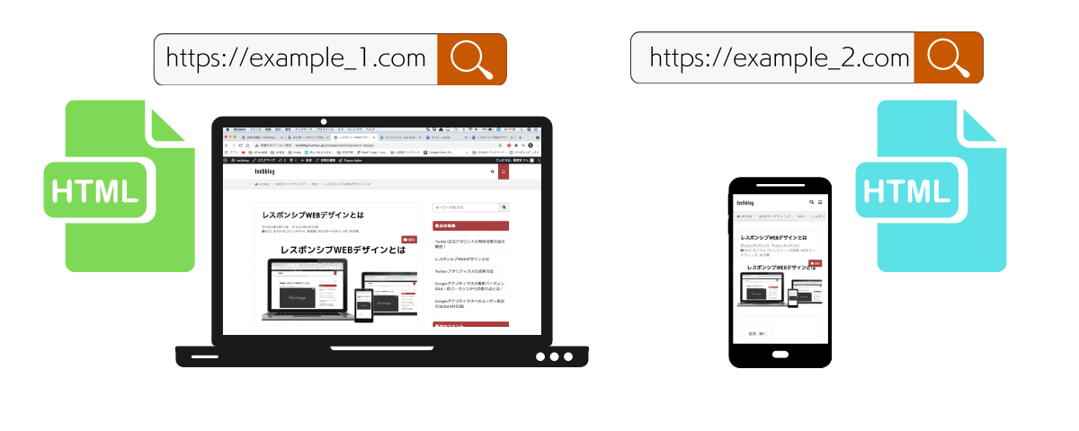 動的な配信とは、URLは一緒でもアクセスするデバイスごとに異なるHTMLとCSSを表示するコーディング方法です。